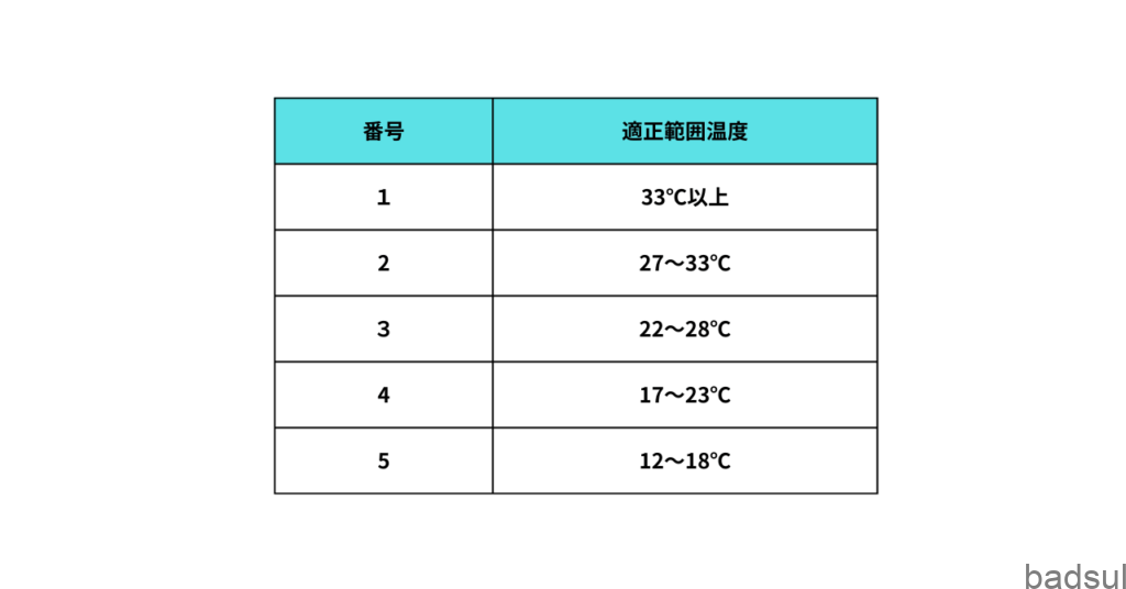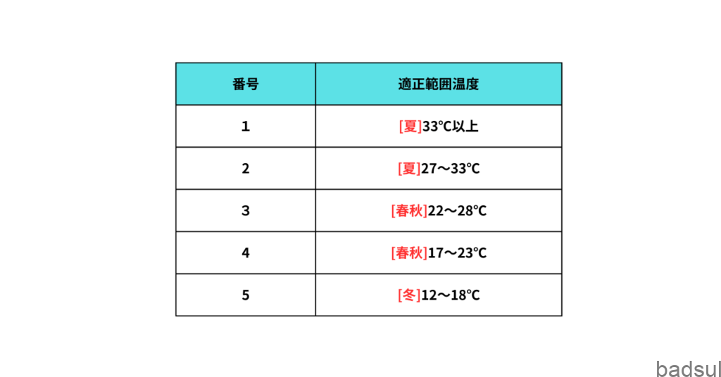先ほどスピード番号と適正範囲温度の表をお見せしましたが、これを季節に落とし込むと以下のようになります。